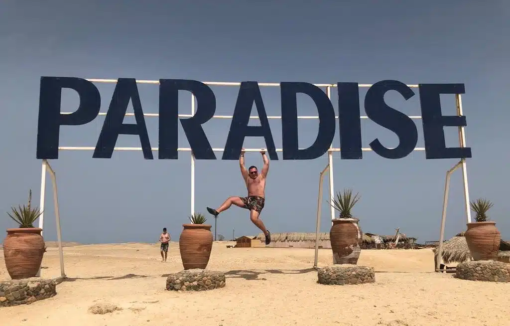Słynnach huśtawka w porzu na tle napisu PARADISE. Rejs na wyspę Paradise z nurkowaniem z Wycieczki Hurghada.